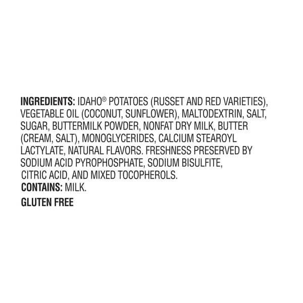 Idaho® Potatoes (russet And Red Varieties), Vegetable Oil (coconut, Sunflower), Maltodextrin, Salt, Sugar, Buttermilk Powder, Nonfat Dry Milk, Butter (cream, Salt), Monoglycerides, Calcium Stearoyl Lactylate, Natural Flavors, Freshness Preserved By Sodium Acid Pyrophosphate, Sodium Bisulfite, Citric Acid, And Mixed Tocopherols