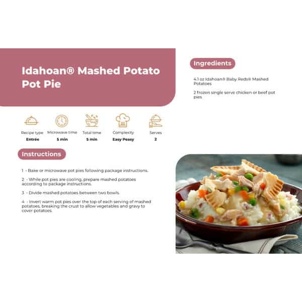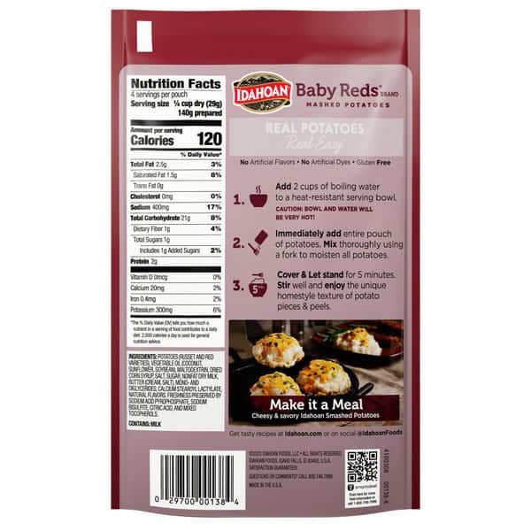 Whip up delicious, rich mashed potatoes in minutes with Idahoan Baby Reds Mashed Potatoes! Our instant mashed potatoes are always made with 100-Percent Real Idaho potatoes. Perfect for a variety of wholesome recipes, Idahoan Baby Reds Mashed Potatoes are easy to prepare and ready in minutes. Simply heat water on stovetop or in a microwave, add the entire pouch of mashed potatoes, and voilà ! Each order includes 1 (4.1oz) pouch with 4 (1/2 cup) servings. Our mission of innovation will continue to bring you quality 100-percent REAL Idaho potatoes in all the ways you love. Whether it’s quality mashed potatoes, soups, casseroles or hash browns, in a pouch, bowl, cup or more, Idahoan Foods will continue to bring you Homemade Taste—Every Time