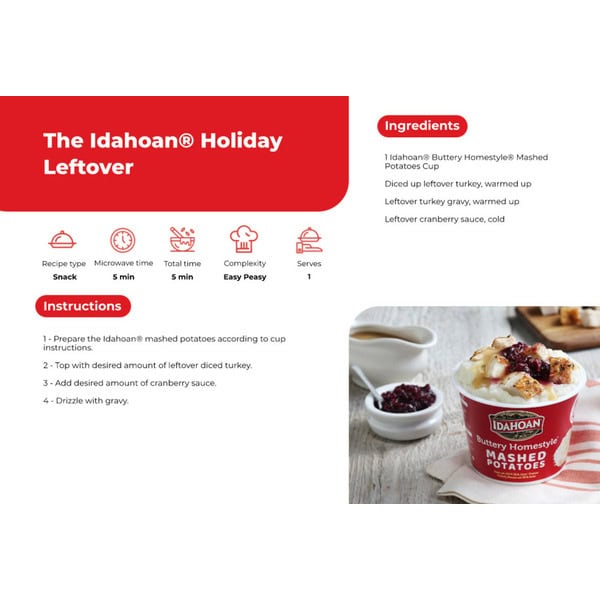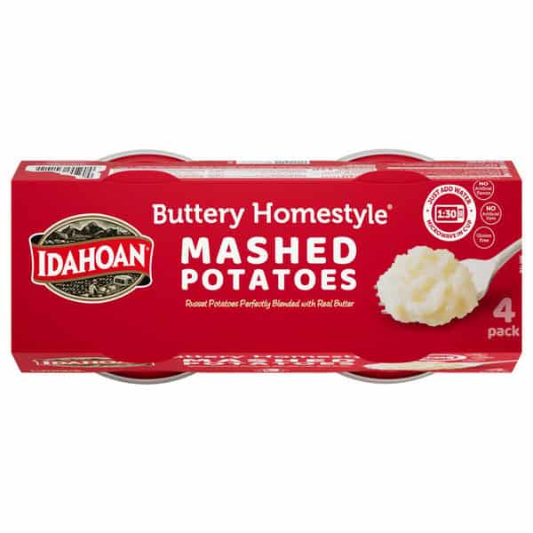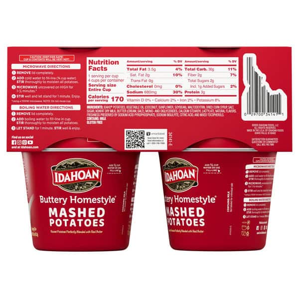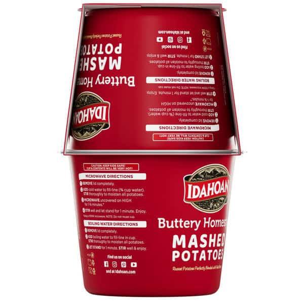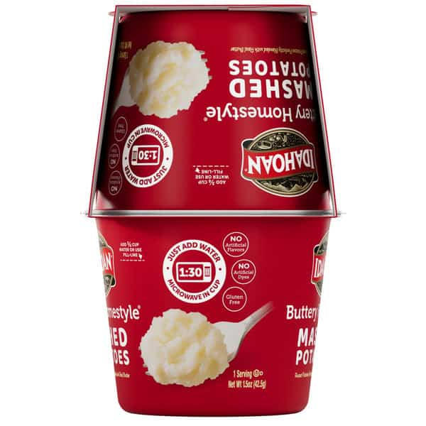 Whip up delicious, rich mashed potatoes in minutes with Idahoan Buttery Homestyle Mashed Potatoes! We’re sure you’ll find many great uses for Idahoan’s Buttery Homestyle Mashed Potatoes Cup, from snacks to work-time lunch sides. The flavor of Idahoan’s best, now in an ultra-convenient pack. Our instant mashed potatoes are always made with 100% Real Idaho potatoes make for a classic favorite. Perfect for a variety of wholesome recipes, Idahoan Buttery Homestyle Mashed Potatoes are easy to prepare and ready in minutes. Simply add cold water to fill-line in cup, stir, microwave for 1 1/2 minutes, and voilà ! Each order includes 4 (1.5oz) cups. Whether you’re looking for traditional comfort food, or wanting a modern spin on classic dishes, Idahoan delivers Homemade Taste—Every Time.