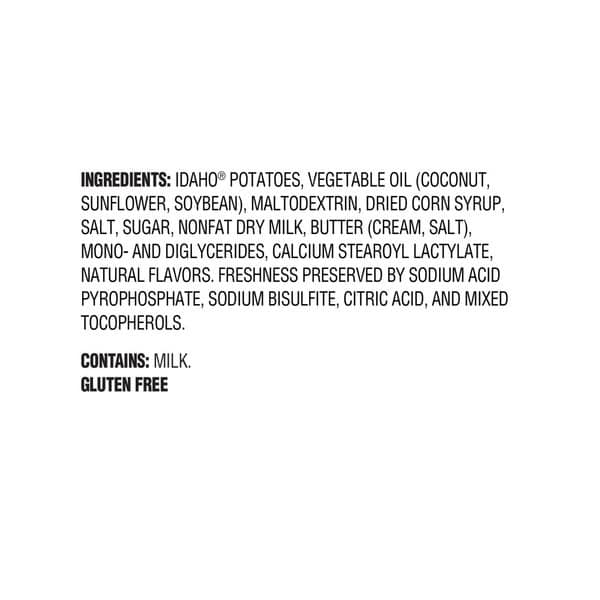 Idaho Potatoes, Vegetable Oil (coconut, Sunflower), Maltodextrin, Salt, Sugar, Buttermilk Powder, Nonfat Dry Milk, Butter (cream, Salt), Monoglycerides, Calcium Stearoyl Lactylate, Natural Flavors. Freshness Preserved By Sodium Acid Pyrophosphate, Sodium Bisulfite, Citric Acid, And Mixed Tocopherols.