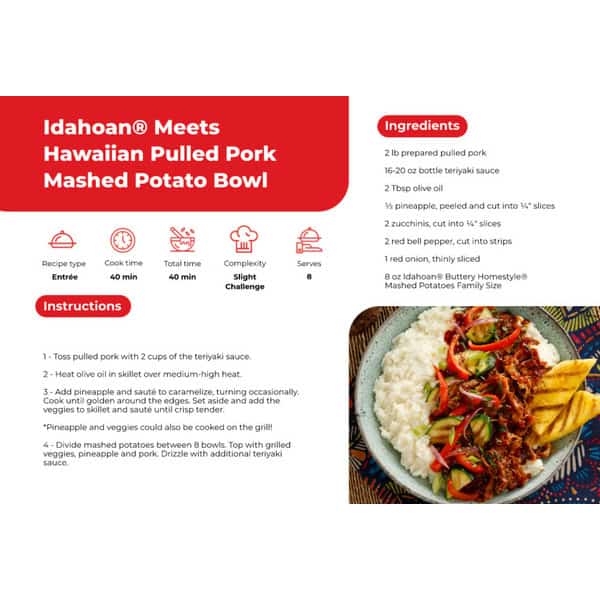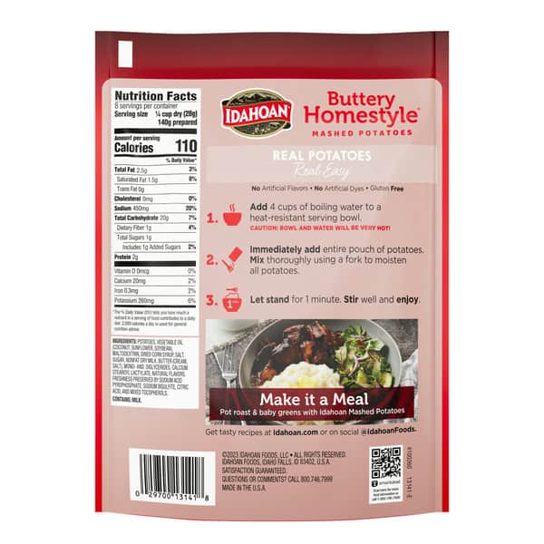 Whip up delicious, rich mashed potatoes in minutes with Idahoan Buttery Homestyle Mashed Potatoes! Our mashed potatoes are always made with 100-Percent Real Idaho potatoes and perfectly blended with rich real butter for a classic favorite. Perfect for a variety of wholesome recipes, Idahoan Buttery Homestyle Mashed Potatoes are easy to prepare and ready in minutes. Simply heat water on stovetop or in a microwave, add the entire pouch of mashed potatoes, and voilà! Each eight oz pouch has eight (half cup) servings. Our mission of innovation will continue to bring you quality 100-percent REAL Idaho potatoes in all the ways you love. Whether it’s quality mashed potatoes, casseroles or hash browns, in a pouch, cup or more, Idahoan Foods will continue to bring you Homemade Taste—Every Time.