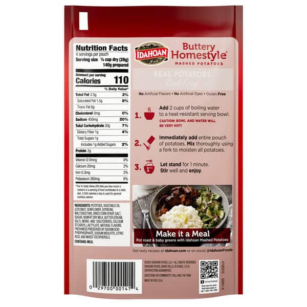 Whip up delicious, rich mashed potatoes in minutes with Idahoan Buttery Homestyle Mashed Potatoes! Our instant mashed potatoes are always made with 100-Percent Real Idaho potatoes and perfectly blended with rich real butter for a classic favorite. Perfect for a variety of wholesome recipes, Idahoan Buttery Homestyle Mashed Potatoes are easy to prepare and ready in minutes. Simply heat water on stovetop or in a microwave, add the entire pouch of mashed potatoes, and voilà! Each order includes 1 (4oz) pouch with 4 (1/2 cup) servings. Our mission of innovation will continue to bring you quality 100-percent REAL Idaho potatoes in all the ways you love. Whether it’s quality mashed potatoes, soups, casseroles or hash browns, in a pouch, bowl, cup or more, Idahoan Foods will continue to bring you Homemade Taste—Every Time