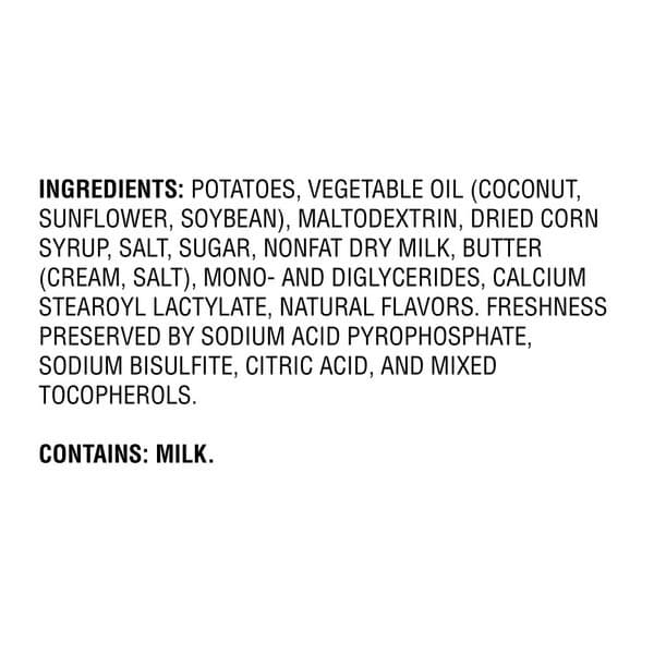 Idaho Potatoes, Vegetable Oil (coconut, Sunflower), Maltodextrin, Salt, Sugar, Buttermilk Powder, Nonfat Dry Milk, Butter (cream, Salt), Monoglycerides, Calcium Stearoyl Lactylate, Natural Flavors. Freshness Preserved By Sodium Acid Pyrophosphate, Sodium Bisulfite, Citric Acid, And Mixed Tocopherols.