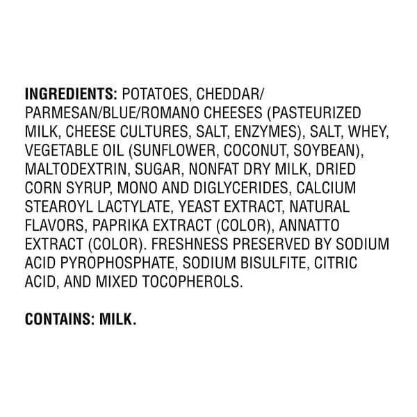 Idaho Potatoes, Four Cheese Blend [cheddar Cheese Blend [whey, Maltodextrin, Reduced Lactose Whey, Canola Oil, Cheddar And Blue Cheese (cultured Milk, Salt, Enzymes), Salt, Disodium Phosphate, Whey Protein Concentrate, Citric Acid, Lactic Acid, Artificial Color (including Fd&c Yellow #6 And #5)], Romano And Parmesan Cheeses [pasteurized Milk, Cheese Cultures, Salt, Enzymes, Disodium Phosphate]), Vegetable Oil (contains One Or More Of The Following: Coconut, Palm, Soybean, Cottonseed, Sunflower, Canola), Salt, Corn Syrup Solids, Sugar, Whey Powder, Nonfat Dry Milk, Natural And Artificial Flavor (milk, Soy), Maltodextrin, Mono And Diglycerides, Calcium Stearoyl Lactylate, Spice, Artificial Color (including Fd&c Yellow #5 And #6), Sodium Acid Pyrophosphate (preserve Freshness), Sodium Bisulfite (preserve Freshness), Citric Acid (preserve Freshness), Sodium Caseinate, Dipotassium Phosphate, Disodium Inosinate, Disodium Guanylate, Mixed Tocopherols (preserve Freshness) And Less Than 2.0% Silicon Dioxide Added As An Anti-caking Agent.