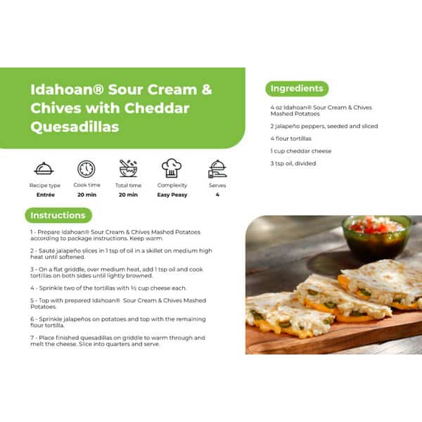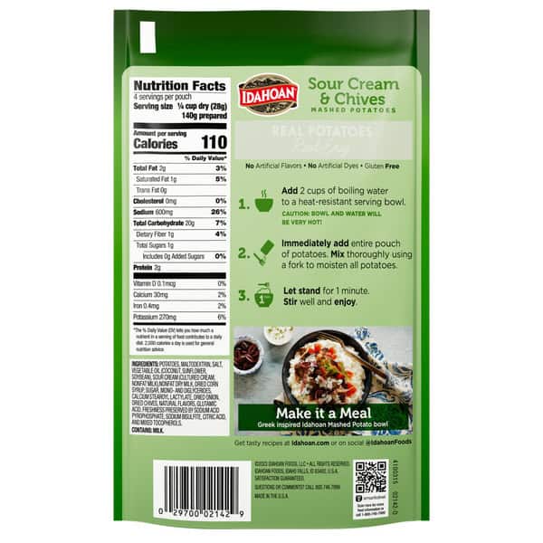 Whip up delicious, rich mashed potatoes in minutes with Idahoan Sour Cream & Chives Mashed Potatoes! Our instant mashed potatoes are always made with 100-Percent Real Idaho potatoes. Perfect for a variety of wholesome recipes, Idahoan Sour Cream & Chives Mashed Potatoes are easy to prepare and ready in minutes. Simply heat water on stovetop or in a microwave, add the entire pouch of mashed potatoes, and voilà ! Each order includes 1 (4oz) pouch with 4 (1/2 cup) servings. Our mission of innovation will continue to bring you quality 100-percent REAL Idaho potatoes in all the ways you love. Whether it’s quality mashed potatoes, soups, casseroles or hash browns, in a pouch, bowl, cup or more, Idahoan Foods will continue to bring you Homemade Taste—Every Time
