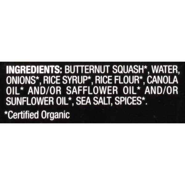 Water, Butternut Squash*, Onions*, Rice Syrup*, Rice Flour*, Canola Oil*, Sea Salt, Cinnamon.*