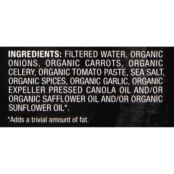 Filtered Water, Organic Onions, Organic Carrots, Organic Celery, Organic Tomato Paste, Sea Salt, Organic Spices, Organic Garlic, Organic Expeller Pressed Canola Oil And/or Organic Safflower Oil And/or Organic Sunflower Oil*, *adds A Trivial Amount Of Fat