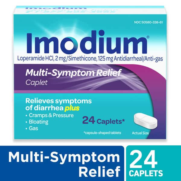 Imodium Multi-Symptom Relief Caplets are the only over-the-counter brand of anti-diarrheal medicine that combines two powerful medicines to relieve symptoms of diarrhea, as well as gas, cramps, pressure and bloating. Each caplet contains 2 milligrams of loperamide hydrochloride to help relieve diarrhea, and 125 milligrams of simethicone to help other associated symptoms such as gas, bloating and cramps. From the #1 doctor-recommended brand of anti-diarrheal products, the proven formula works with your body to slow down your system and helps restore the natural rhythm of your digestive system. Intended for adults and children ages 12 and older, this multi-symptom diarrhea medicine effective relief and is ideal for use anywhere, both at home or on-the-go.