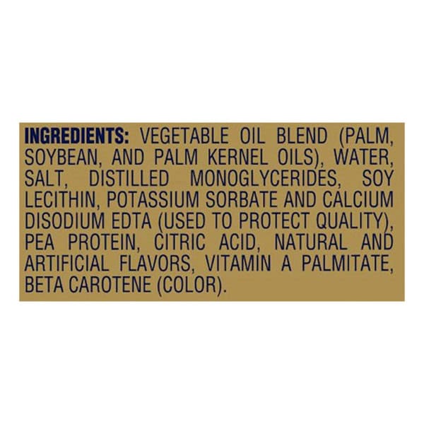 Water, Vegetable Oil Blend (palm, Soybean And Palm Kernel Oils, Salt, Distilled Monoglycerides, Soy Lecithin, Potassium Sorbate And Calcium Disodium Edta (used To Protect Quality), Pea Protein, Citric Acid, Natural And Artificial Flavors, Vitamin A Palmitate, Beta Carotene (color)