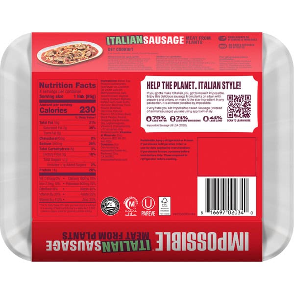 Ever heard of Italian food? Apparently, it has been trending since like 4 BC. So we jumped on the trend and made our perfectly seasoned, super-meaty Impossible™ Italian sausage from plants for people who love meat and also Italian flavors—so yeah, this one covers everyone. It delivers that iconic snap, sizzle and flavor of animal-based Italian sausage, plus it’s nutrient-packed with 14 g protein, 0 mg cholesterol and 5 g dietary fiber per link. Oh didn’t you know you can get fiber via sausage these days? What a wonderful time to be alive. Serve in their delicious, naked glory or add to sandos, pastas, soups or whatever! Look for the red Impossible package in the refrigerated case or just hit Add to Cart.