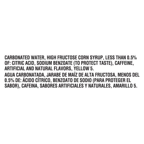 Carbonated Water, High Fructose Corn Syrup, Less Than 0.5% Of Citric Acid, Sodium Benzoate (to Protect Taste), Caffeine, Artificial And Natural Flavors, Yellow 5.