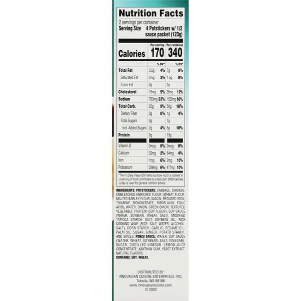Ingredients: Potstickers: Cabbage, Chicken, Unbleached Enriched Flour (wheat Flour, Malted Barley Flour, Niacin, Reduced Iron, Thiamine Mononitrate, Riboflavin, Folic Acid), Water, Onion, Green Onion, Textured Vegetable Protein (soy Flour), Soy Sauce (water, Soybean, Wheat, Salt), Modified Tapioca Starch, Salt, Soybean Oil, Rice Cooking Wine (rice, Salt, Water, Alcohol, Salt), Corn Starch, Garlic, Sesame Oil, Palm Oil, Sugar, Ginger, Potato Starch, And Spices. Ponzu Sauce: Water, Soy Sauce (water, Wheat, Soybean, Salt, Vinegar), Sugar, Distilled Vinegar, Lemon Juice Concentrate, Xanthan Gum, Yeast Extract, Natural Flavors. Contains: Sesame, Soy, Wheat.