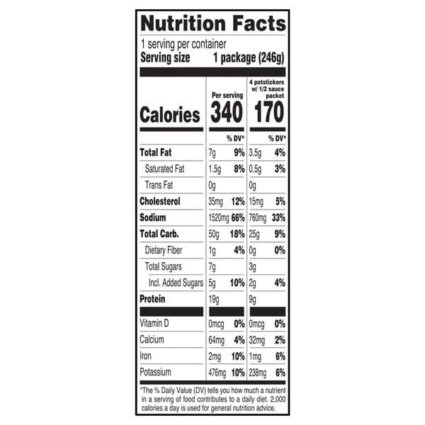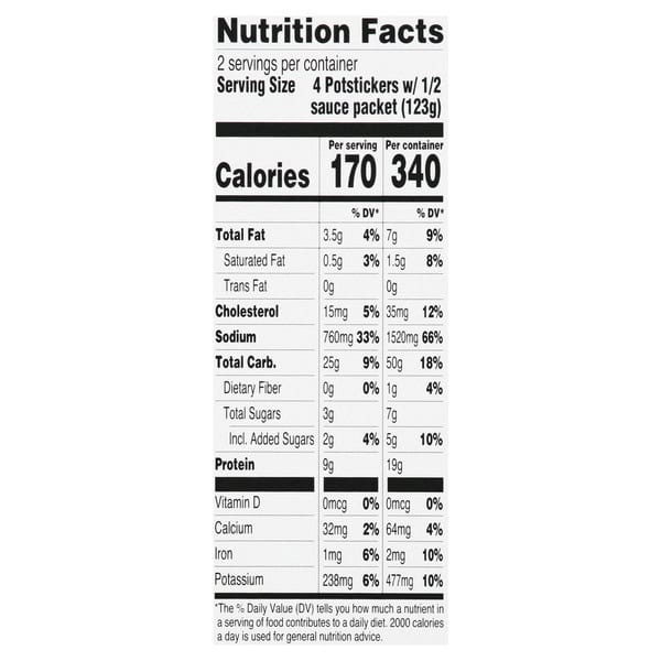Cook thoroughly. Cooking Instructions: Pan Fry: 1. Preheat 2 tablespoons of vegetable oil in a skillet or wok on medium high for 1 minute. 2. Place frozen potstickers in skillet or wok, and heat on medium high for 4 minutes or until skins turn lightly brown. 3. Reduce heat to medium. Carefully add 4 tablespoons of water to skillet or wok, cover and steam potstickers for 5 minutes or until water has evaporated and potstickers begin to brown (Internal temperature should be 165 degree F for at least 15 seconds. These instructions are guidelines only since individual cooking equipment varies in temperature). Caution: Cover immediately when adding water to avoid burns from splatter. 4. Serve immediately with dipping sauce. Steam: 1. Place frozen potstickers in a steamer. 2 .Steam for 7-10 minutes or until potstickers are hot (Internal temperature should be 165 degree F for at least 15 seconds. These instructions are guidelines only since individual cooking equipment varies in temperature). 3. Serve immediately with dipping sauce. Ponzu Sauce: Place sauce pouch in blow with warm water to thaw. Microwave: 1. Place potstickers in a microwave safe container. 2. Cover with plastic wrap and puncture 5 small holes to vent steam. 3. Heat on high for 3 minutes or until hot (Internal temperature should be 165 degree F for at least 15 seconds. These instructions are guidelines only since individual cooking equipment varies in temperature). 4. Serve immediately with dipping sauce. Note: Microwave operating at 1200 watts. Microwaves may vary, adjust cook times to individual microwave.