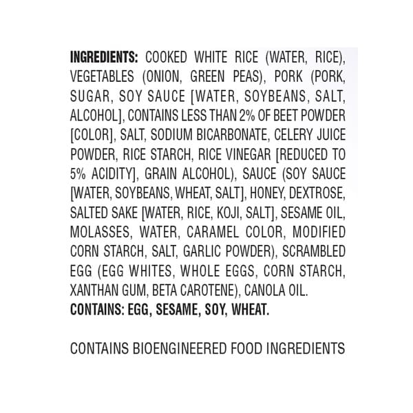 Cooked White Rice(water, Rice), Vegetables (onion, Green Peas), Pork(pork, Sugar, Soy Sauce [water, Soybeans, Salt, Alcohol], Contains Less Than 2% Of Beet Powder [color], Salt, Sodium Bicarbonate, Celery Juice Powder, Rice Starch, Rice Vinegar [reduced To 5% Acidity], Grain Alcohol), Sauce (soy Sauce [water, Soybeans, Wheat Salt], Honey, Dextrose, Salted Sake, [water, Rice, Koji, Salt], Sesame Oil, Molasses, Water, Caramel Color, Modified Corn Starch, Salt, Garlic Powder), Scrambled Egg (egg Whites, Whole Eggs, Corn Starch, Xanthan Gum, Beta Carotene), Canola Oil. Contains: Egg, Sesame, Soy, Wheat. Contains Bioengineered Food Ingredients