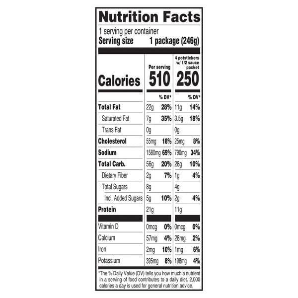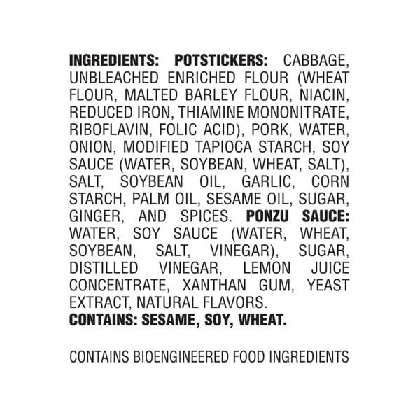 Ingredients: Potstickers: Cabbage, Unbleached Enriched Flour (wheat Flour, Malted Barley Flour, Niacin, Reduced Iron, Thiamine Mononitrate, Riboflavin, Folic Acid), Pork, Water, Onion, Modified Tapioca Starch, Soy Sauce (water, Soybean, Wheat, Salt), Salt, Soybean Oil, Garlic, Corn Starch, Palm Oil, Sesame Oil, Sugar, Ginger, And Spices. Ponzu Sauce: Water, Soy Sauce (water, Wheat, Soybean, Salt, Vinegar), Sugar, Distilled Vinegar, Lemon Juice Concentrate, Xanthan Gum, Yeast Extract, Natural Flavors. Contains: Sesame, Soy, Wheat.
