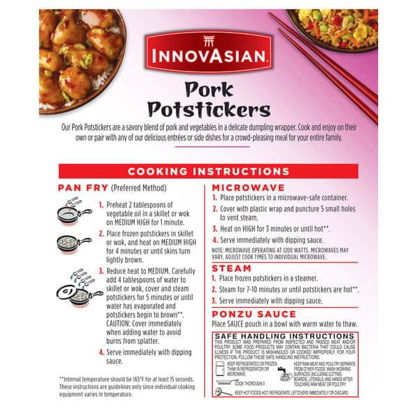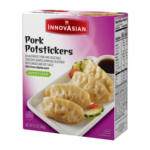 InnovAsian Pork Potsticker 8.7 ounce Appetizers are delicious crescent shaped dumplings with pork, vegetables and seasoned with garlic, ginger and soy sauce. Make it a meal and serve with InnovAsian Vegetable Fried Rice, General Tso’s or add one of our delicious appetizers!