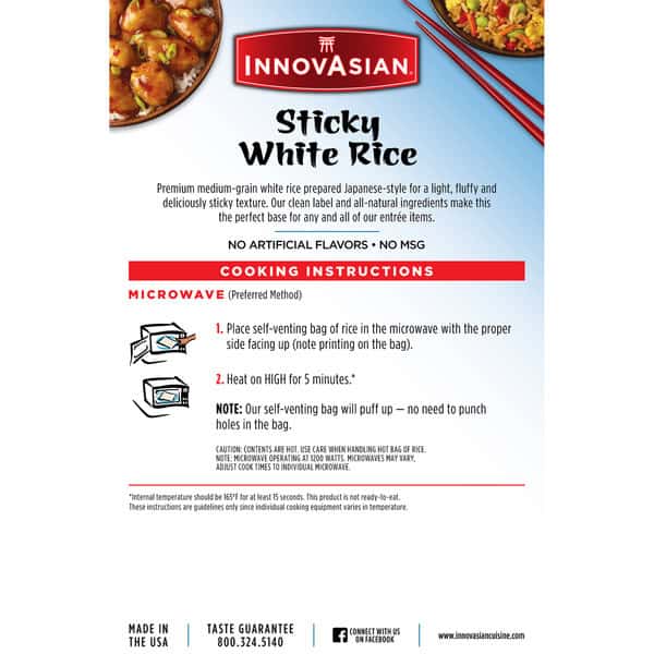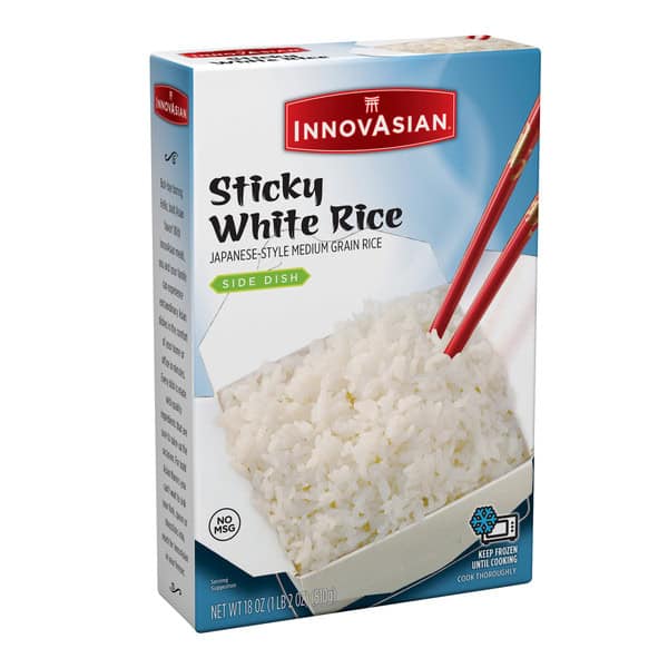 InnovAsian Sticky White Rice 18 ounce frozen side dish is made with medium-grain rice for a traditional Japanese-style stickiness that pairs perfectly with our delicious Asian meals. It also contains no added MSG or trans fats and nothing artificial. Make it a meal and serve with InnovAsian Orange Chicken, General Tso’s or add one of our delicious noodle dishes or appetizers!