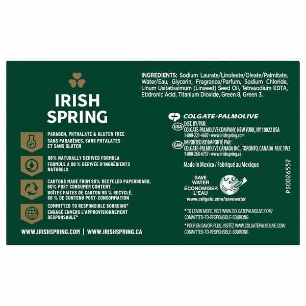 • Irish Spring soap bars are paraben and phthalate free and are made with a 98% naturally derived formula that keeps you fresh for 12 hours