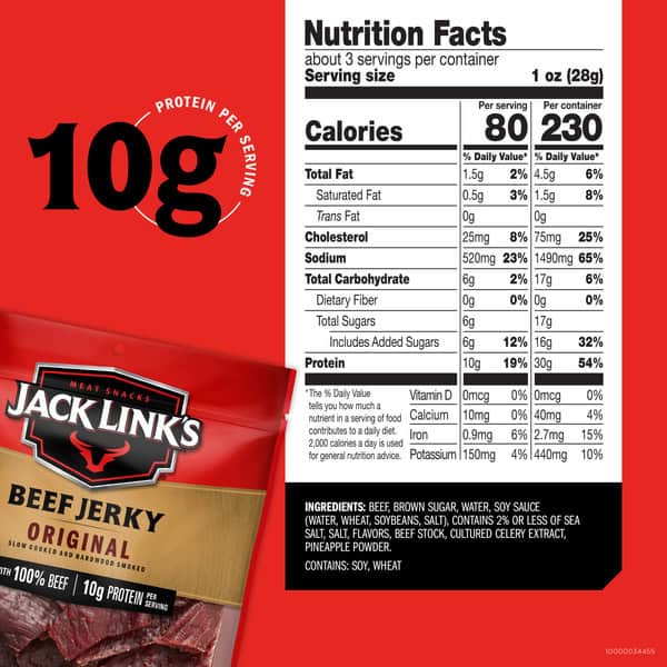 Snack on our easy-to-devour beef jerky! Jack Link’s Original Beef Jerky is a savory snack that is ready for any adventure and makes taste buds go wild. We start with lean beef and then marinate it in our signature seasoning blend that includes notes of cracked black pepper, onion, and garlic. Then we slow cook it until it reaches the perfect tenderness and the smoky flavor everyone loves. Is your mouth watering yet? When snackin’ time is slim, save time with a quick and craveable meat snack that will help satisfy hunger cravings. No need for any more chalky-tasting protein bars when you can get your protein fix with good ole Original beef jerky! Whether it’s a work break snack, post-pub grub, or a family road trip favorite, our savory beef jerky will make you want to Feed Your Wild Side. Grab a Sasquatch®-approved snack today and see for yourself! Our Wisconsin-born family business, also known as America’s #1 meat snack brand, delivers high quality, great tasting, and convenient snacks that help fuel your everyday adventures., MADE WITH 100% BEEF: Our lean cuts of beef are part of why our beef jerky is so tender and delicious, 10G OF PROTEIN AND 80 CALORIES PER SERVING: Our Original Beef Jerky is a good source of protein that satisfies hunger and taste buds, SMOKY AND FLAVORFUL: Our carefully selected cuts of beef are marinated in our signature seasoning blend, then smoked and slow cooked over real hardwood, RESEALABLE PACKAGING: Jack Link’s packaging is designed with busy lifestyles in mind. We use resealable bags to ensure your beef jerky stays portable and keeps air moisture out, NO NONSENSE: No nitrates or nitrites except for those naturally occurring in sea salt and cultured celery extract