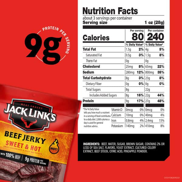 Don’t let anyone tell you can’t channel your inner savage. Unleash your potential with Jack Link’s Sweet & Hot Beef Jerky and make Sasquatch proud. We use a unique seasoning mix that includes brown sugar and fiery punches of red chili peppers to marinate our lean cuts of beef. Then, we slow cook and smoke every slice until they reach the perfect tenderness that makes our beef jerky easy to chew. Enjoy the satisfying flavor of our sweet, smoky, and spicy beef jerky. You deserve a devilishly daring snacking experience – so look no further! From football stadiums to county fairs, the best way to eat Jack Link’s Sweet & Hot jerky is to drink an ice-cold beverage along with it. Crush cravings with a legendary snack and satisfy your appetite., MADE WITH 100% BEEF: Our lean cuts of beef are part of why our savory jerky is so tender and delicious, 9G OF PROTEIN AND 80 CALORIES PER SERVING: Our Original Beef Jerky is a good source of protein that satisfies hunger and taste buds, SWEET & SPICY: Our lean and tender beef is made with real spices including spicy red pepper, cracked black pepper, and brown sugar, RESEALABLE PACKAGING: Jack Link’s packaging is designed with busy lifestyles in mind. Our half-pounder bag is resealable to ensure your beef jerky stays portable, NO NONSENSE: No nitrates or nitrites except for those naturally occurring in sea salt and cultured celery extract