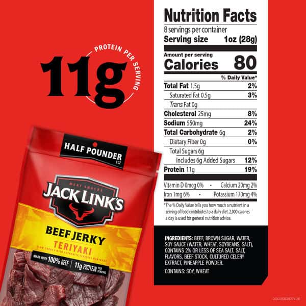 Sasquatch lives in the forest because he’s not too keen on civilization. But something he is keen on? Teriyaki Beef Jerky. It’s sweet, savory, and not spicy at all, making it a great snack choice for all ages! Taste our signature sweet and salty Teriyaki sauce made with real ingredients like soy sauce, ginger, and sweet brown sugar. Fill your pantry, your lunchbox, and your pockets with a tasty snack. Believe us, as fellow adventurers, we won’t judge! Even when you’re on the go, it’s easy to reach for our ready-to-eat beef jerky – and besides, Jack Link’s packaging is resealable, so each bite tastes as fresh as the last! When you are looking for a sweet snack, eat something more wholesome than your kids’ leftover Halloween candy. At 11g of protein and just 80 calories per serving, you can enjoy biting into Jack Link’s Teriyaki Beef Jerky., MADE WITH 100% BEEF: Our lean cuts of beef are part of why our beef jerky is so tender and delicious, 11G OF PROTEIN AND 80 CALORIES PER SERVING: Our Original Beef Jerky is a good source of protein that satisfies hunger and taste buds, SWEET & SAVORY FLAVOR: Our carefully chosen cuts of beef are marinated in a real Teriyaki recipe that includes, soy sauce, ginger, and brown sugar, HALF-POUNDER: Jack Link’s half-pounder bags are designed with busy lifestyles in mind. We use resealable bags to ensure your beef jerky stays portable, NO NONSENSE: No nitrates or nitrites except for those naturally occurring in sea salt and cultured celery extract