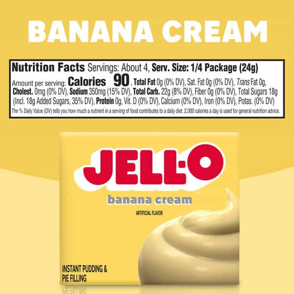 • Jell-O Banana Cream Artificially Flavored Instant Pudding & Pie Filling Mix is a sweet treat on its own as well as a perfect ingredient for dessert recipes
