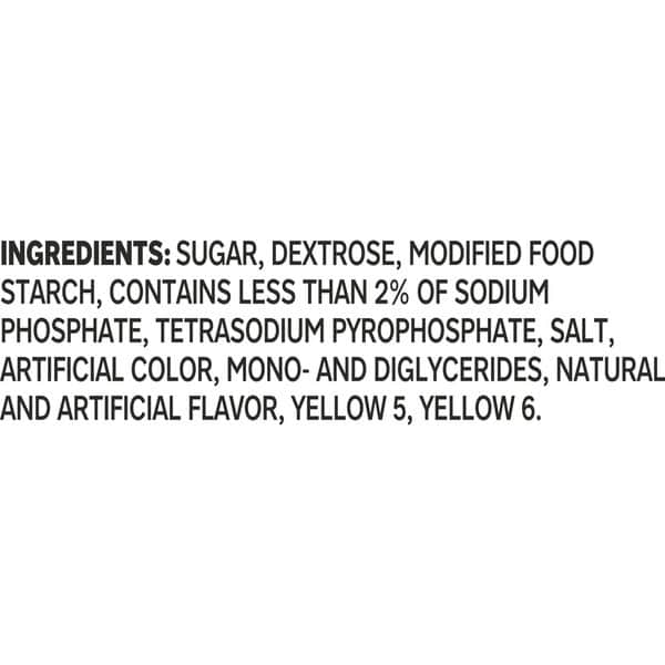 Sugar, Dextrose (from Corn), Modified Cornstarch, Contains Less Than 2% Of Natural And Artificial Flavor, Salt, Disodium Phosphate And Tetrasodium Pyrophosphate (for Thickening), Mono- And Diglycerides (prevent Foaming), Yellow 5, Yellow 6, Artificial Color, Bha (preservative).