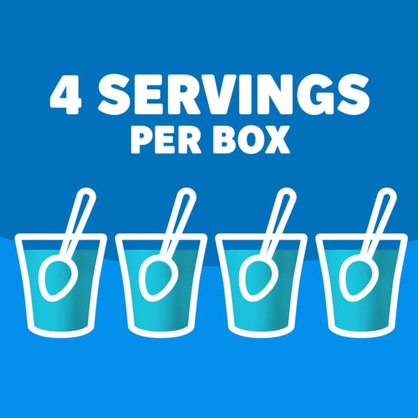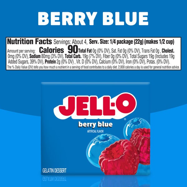 Snack happy. Jell-O Berry Blue Artificially Flavored Gelatin Dessert Mix lets you add some wonder to your day with a convenient snack. Spoon up a smile with our artificially flavored berry blue Jell-O gelatin that contains 90 calories per serving. Our colorful, jiggly treat is perfect for everyday snacking or special occasions with family and friends. Additionally, our gelatin dessert mix is a versatile ingredient for creating delicious desserts like poke cakes, parfaits, pretzel salads, rainbow layer cakes and more. Our artificially flavored berry blue gelatin dessert is easy to prepare. Simply add 1 cup boiling water to the gelatin mix, stir for 2 minutes until completely dissolved, stir in 1 cup cold water, then refrigerate for 4 hours or until firm. Each Jell-O gelatin dessert mix is individually packaged in a 3-ounce sealed pouch and makes 4, 1/2-cup servings.