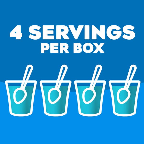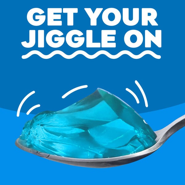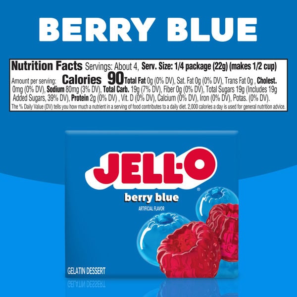 Snack happy. Jell-O Berry Blue Artificially Flavored Gelatin Dessert Mix lets you add some wonder to your day with a convenient snack. Spoon up a smile with our artificially flavored berry blue Jell-O gelatin that contains 80 calories per serving. Our colorful, jiggly treat is perfect for everyday snacking or special occasions with family and friends. Additionally, our gelatin dessert mix is a versatile ingredient for creating delicious desserts like poke cakes, parfaits, pretzel salads, rainbow layer cakes and more. Our artificially flavored berry blue gelatin dessert is easy to prepare. Simply add 1 cup boiling water to the gelatin mix, stir for 2 minutes until completely dissolved, stir in 1 cup cold water, then refrigerate for 4 hours or until firm. Each Jell-O gelatin dessert mix is individually packaged in a 3-ounce sealed pouch and makes 4, 1/2-cup servings.