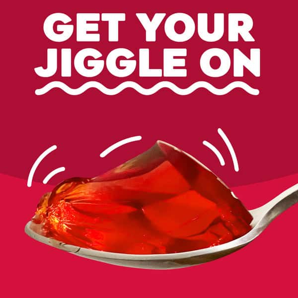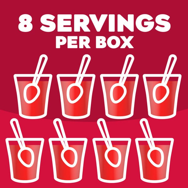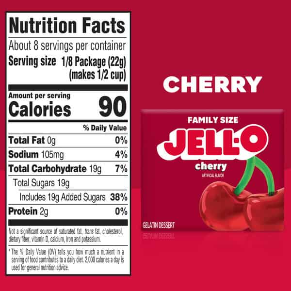 Snack happy. Jell-O Cherry Artificially Flavored Gelatin Dessert Mix lets you add some wonder to your day with a delicious snack. Spoon up a smile with our artificially flavored cherry Jell-O gelatin that contains 80 calories per serving. Our colorful, jiggly treat is perfect for everyday snacking or special occasions with family and friends. Additionally, our gelatin dessert mix is a versatile ingredient for creating desserts like poke cakes, parfaits, pretzel salads, rainbow layer cakes and more. Our artificially flavored cherry gelatin dessert is easy to prepare. Simply add 2 cups boiling water to the gelatin mix, stir for 2 minutes until completely dissolved, stir in 2 cups cold water, then refrigerate for 4 hours or until firm. Each family size Jell-O gelatin dessert mix is individually packaged in a 6-ounce sealed pouch and makes 8, 1/2-cup servings.