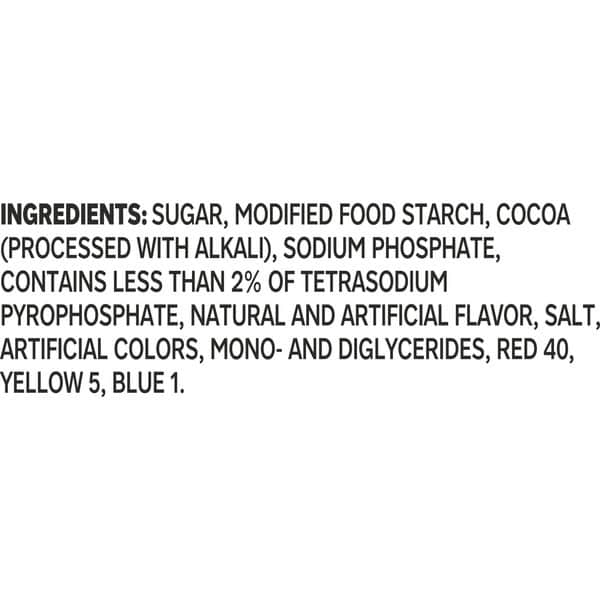 Sugar, Modified Food Starch, Cocoa (processed With Alkali), Sodium Phosphate, Contains Less Than 2% Of Tetrasodium Pyrophosphate, Natural And Artificial Flavor, Salt, Artificial Colors, Mono- And Diglycerides, Red 40, Yellow 5, Blue 1