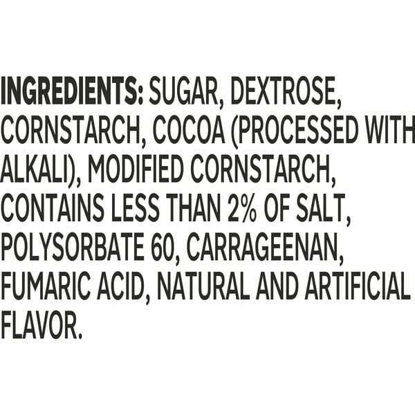 Sugar, Dextrose, Cornstarch, Cocoa (processed With Alkali), Modified Cornstarch, Contains Less Than 2% Of Salt, Polysorbate 60, Carrageenan, Fumaric Acid, Natural And Artificial Flavor