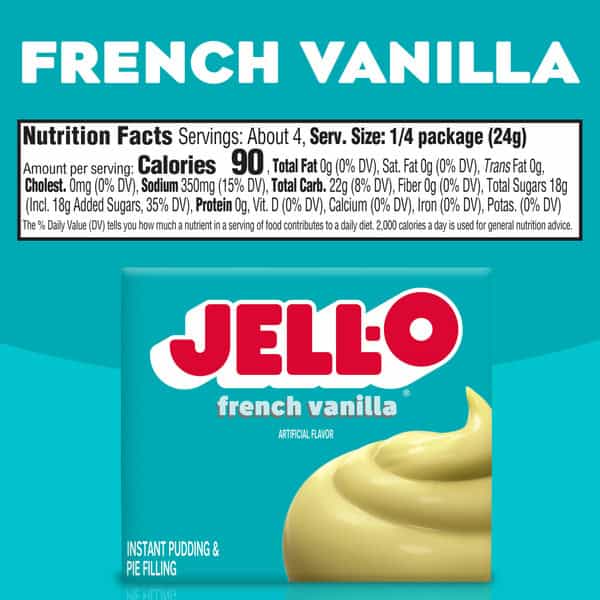 • Jell-O French Vanilla Artificially Flavored Instant Pudding & Pie Filling Mix is a sweet treat on its own as well as a perfect ingredient for dessert recipes