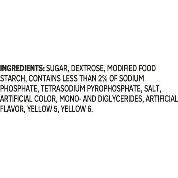 Sugar, Dextrose, Modified Food Starch, Contains Less Than 2% Of Sodium Phosphate, Tetrasodium Pyrophosphate, Salt, Artificial Color, Mono- And Diglycerides, Artificial Flavor, Yellow 5, Yellow 6