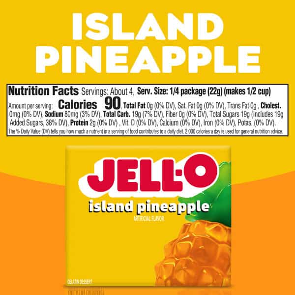 Snack happy. Jell-O Island Pineapple Artificially Flavored Gelatin Dessert Mix lets you add some wonder to your day with a delicious snack. Spoon up a smile with our artificially flavored pineapple Jell-O gelatin that contains 80 calories per serving. Our colorful, jiggly treat is perfect for everyday snacking or special occasions with family and friends. Additionally, our gelatin dessert mix is a versatile ingredient for creating desserts like poke cakes, parfaits, pretzel salads, rainbow layer cakes and more. Our artificially flavored pineapple gelatin dessert is easy to prepare. Simply add 1 cup boiling water to the gelatin mix, stir for 2 minutes until completely dissolved, stir in 1 cup cold water, then refrigerate for 4 hours or until firm. Each Jell-O gelatin dessert mix is individually packaged in a 3-ounce sealed pouch and makes 4, 1/2-cup servings.