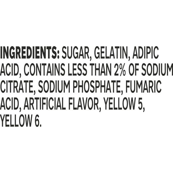 Sugar, Gelatin, Adipic Acid, Contains Less Than 2% Of Sodium Citrate, Sodium Phosphate, Fumaric Acid, Artificial Flavor, Yellow 5, Yellow 6.