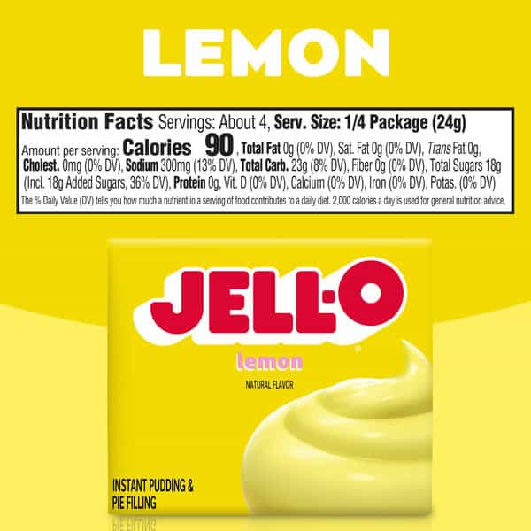 • Jell-O Lemon Naturally Flavored Instant Pudding & Pie Filling Mix is a sweet treat on its own as well as a perfect ingredient for dessert recipes