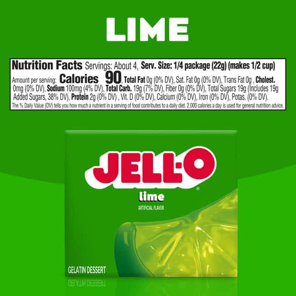Snack happy. Jell-O Lime Artificially Flavored Gelatin Dessert Mix lets you add some wonder to your day with a delicious snack. Spoon up a smile with our artificially flavored lime Jell-O gelatin that contains 80 calories per serving. Our colorful, jiggly treat is perfect for everyday snacking or special occasions with family and friends. Additionally, our gelatin dessert mix is a versatile ingredient for creating desserts like poke cakes, parfaits, pretzel salads, rainbow layer cakes and more. Our artificially flavored lime gelatin dessert is easy to prepare. Simply add 1 cup boiling water to the gelatin mix, stir for 2 minutes until completely dissolved, stir in 1 cup cold water, then refrigerate for 4 hours or until firm. Each Jell-O gelatin dessert mix is individually packaged in a 3-ounce sealed pouch and makes 4, 1/2-cup servings.