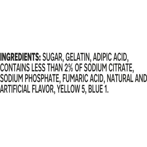 Sugar, Gelatin, Adipic Acid, Contains Less Than 2% Of Sodium Citrate, Sodium Phosphate, Fumaric Acid, Natural And Artificial Flavor, Yellow 5, Blue 1