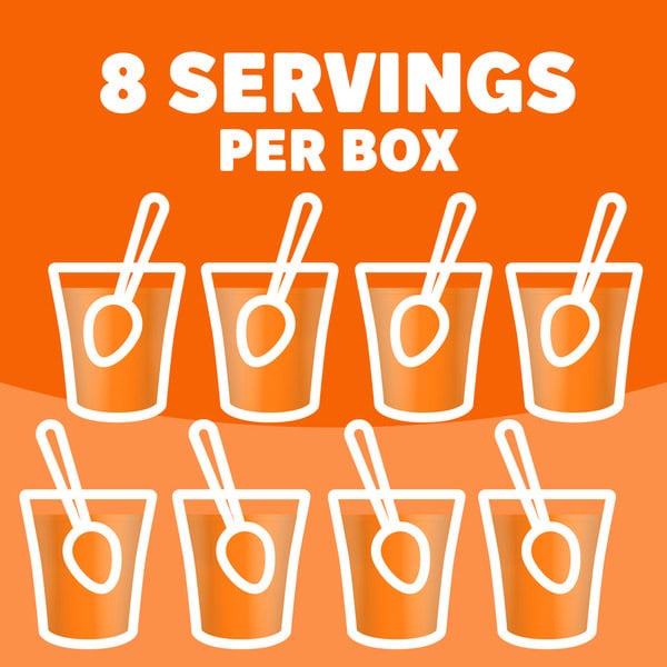 Snack happy. Jell-O Orange Artificially Flavored Gelatin Dessert Mix lets you add some wonder to your day with a delicious snack. Spoon up a smile with our artificially flavored orange Jell-O gelatin that contains 90 calories per serving. Our colorful, jiggly treat is perfect for everyday snacking or special occasions with family and friends. Additionally, our gelatin dessert mix is a versatile ingredient for creating delicious desserts like poke cakes, parfaits, pretzel salads, rainbow layer cakes and more. Our artificially flavored orange gelatin dessert is easy to prepare. Simply add 2 cups boiling water to the gelatin mix, stir for 2 minutes until completely dissolved, stir in 2 cups cold water, then refrigerate for 4 hours or until firm. Each family size Jell-O gelatin dessert mix is individually packaged in a 6-ounce sealed pouch and makes 8, 1/2-cup servings.