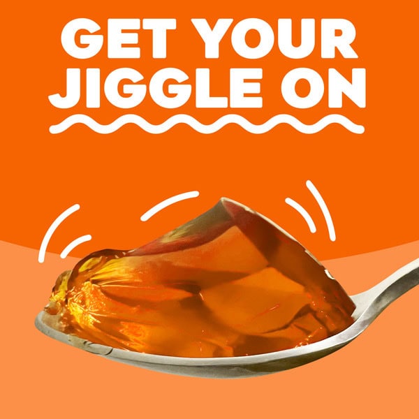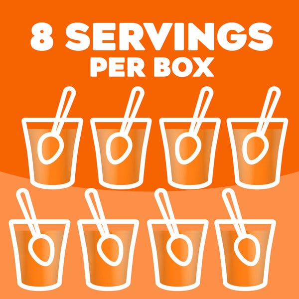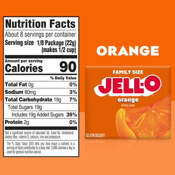 Snack happy. Jell-O Orange Artificially Flavored Gelatin Dessert Mix lets you add some wonder to your day with a delicious snack. Spoon up a smile with our artificially flavored orange Jell-O gelatin that contains 80 calories per serving. Our colorful, jiggly treat is perfect for everyday snacking or special occasions with family and friends. Additionally, our gelatin dessert mix is a versatile ingredient for creating delicious desserts like poke cakes, parfaits, pretzel salads, rainbow layer cakes and more. Our artificially flavored orange gelatin dessert is easy to prepare. Simply add 2 cups boiling water to the gelatin mix, stir for 2 minutes until completely dissolved, stir in 2 cups cold water, then refrigerate for 4 hours or until firm. Each family size Jell-O gelatin dessert mix is individually packaged in a 6-ounce sealed pouch and makes 8, 1/2-cup servings.
