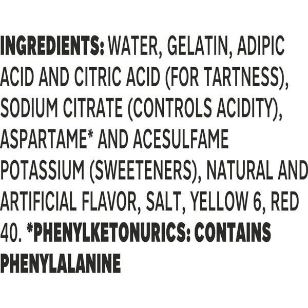 Water, Gelatin, Adipic Acid And Citric Acid (for Tartness), Sodium Citrate (controls Acidity), Aspartame* And Acesulfame Potassium (sweeteners), Natural And Artificial Flavor, Salt, Yellow 6, Red 40.
