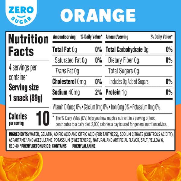 • Jell-O Sugar Free Refrigerated Orange Gelatin is a delicious on-the-go snack