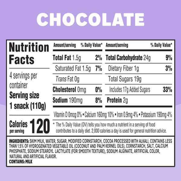 Skim Milk, Water, Sugar, Modified Cornstarch, Cocoa Processed With Alkali, Contains Less Than 1.5% Of Hydrogenated Vegetable Oil (coconut And Palm Kernel Oils), Cornstarch, Salt, Sodium Stearoyl Lactylate (for Smooth Texture), Sodium Alginate, Calcium Phosphate, Natural And Artificial Flavor, Artificial Color, Vitamin A Palmitate, Vitamin D.