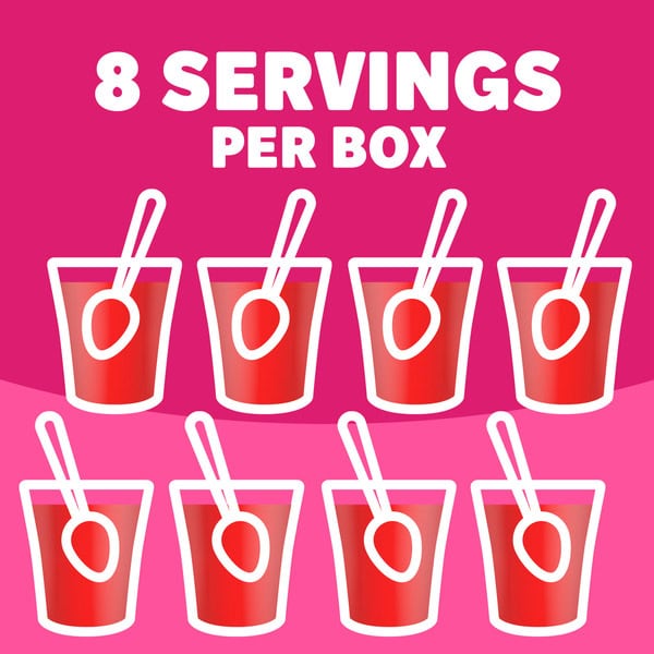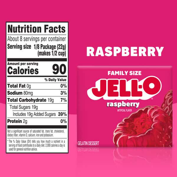 Snack happy. Jell-O Raspberry Artificially Flavored Gelatin Dessert Mix lets you add some wonder to your day with a delicious snack. Spoon up a smile with our artificially flavored raspberry Jell-O gelatin that contains 80 calories per serving. Our colorful, jiggly treat is perfect for everyday snacking or special occasions with family and friends. Additionally, our gelatin dessert mix is a versatile ingredient for creating desserts like poke cakes, parfaits, pretzel salads, rainbow layer cakes and more. Our artificially flavored raspberry gelatin dessert is easy to prepare. Simply add 2 cups boiling water to the gelatin mix, stir for 2 minutes until completely dissolved, stir in 2 cups cold water, then refrigerate for 4 hours or until firm. Each family size Jell-O gelatin dessert mix is individually packaged in a 6-ounce sealed pouch and makes 8, 1/2-cup servings.