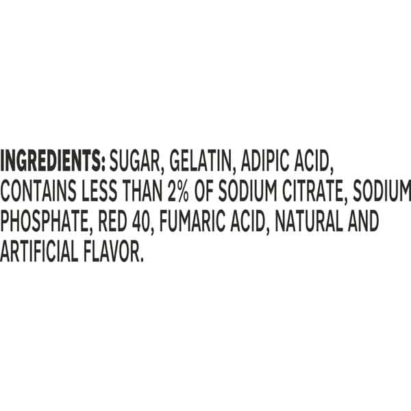 Sugar, Gelatin, Adipic Acid, Contains Less Than 2% Of Sodium Citrate, Sodium Phosphate, Red 40, Fumaric Acid, Natural And Artifical Flavor.