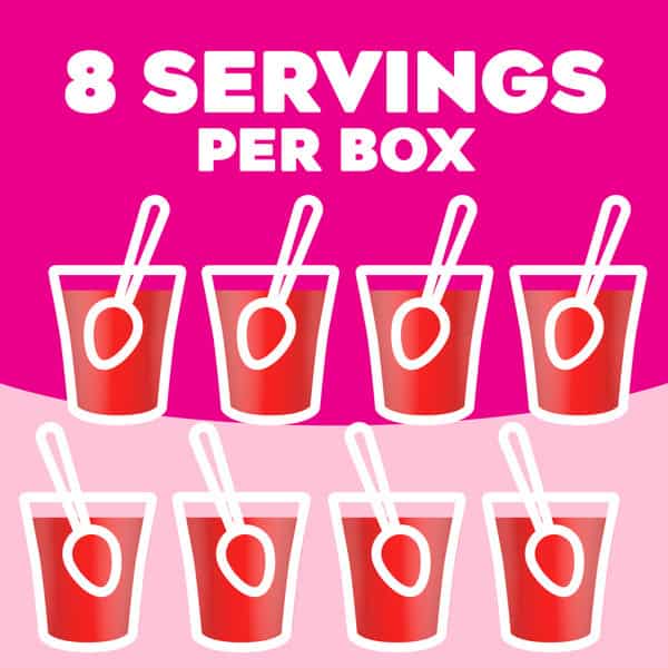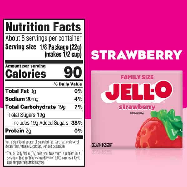 Snack happy. Jell-O Strawberry Artificially Flavored Gelatin Dessert Mix lets you add some wonder to your day with a delicious snack. Spoon up a smile with our artificially flavored strawberry Jell-O gelatin that contains 80 calories per serving. Our colorful, jiggly treat is perfect for everyday snacking or special occasions with family and friends. Additionally, our gelatin dessert mix is a versatile ingredient for creating desserts like poke cakes, parfaits, pretzel salads, rainbow layer cakes and more. Our artificially flavored strawberry gelatin dessert is easy to prepare. Simply add 2 cups boiling water to the gelatin mix, stir for 2 minutes until completely dissolved, stir in 2 cups cold water, then refrigerate for 4 hours or until firm. Each family size Jell-O gelatin dessert mix is individually packaged in a 6-ounce sealed pouch and makes 8, 1/2-cup servings.