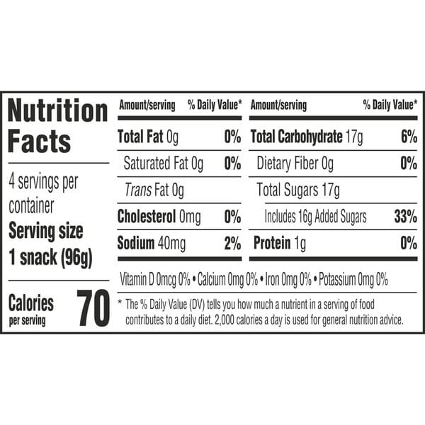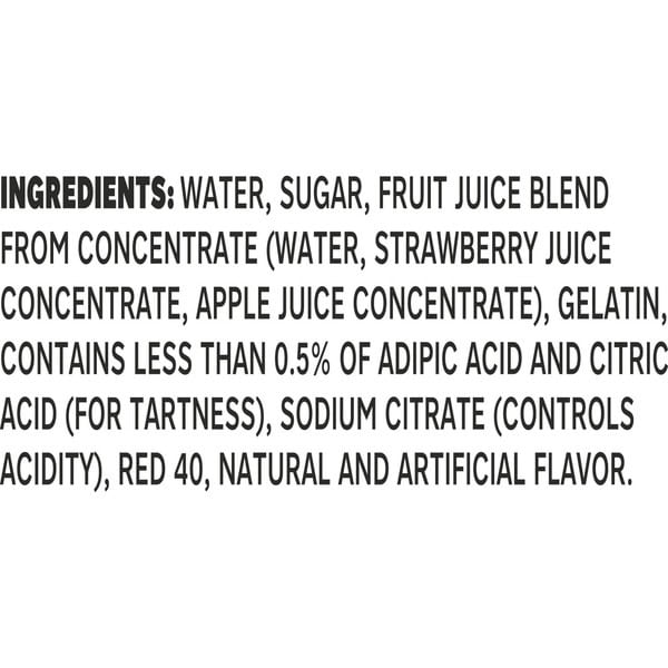 Water, Sugar, Fruit Juice Blend From Concentrate (water, Strawberry Juice Concentrate, Apple Juice Concentrate), Gelatin, Contains Less Than 0.5% Of Adipic Acid And Citric Acid (for Tartness), Sodium Citrate (controls Acidity), Red 40, Natural And Artificial Flavor