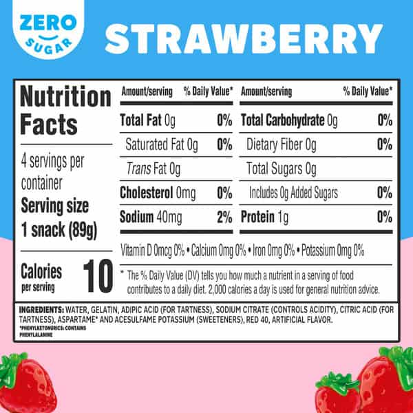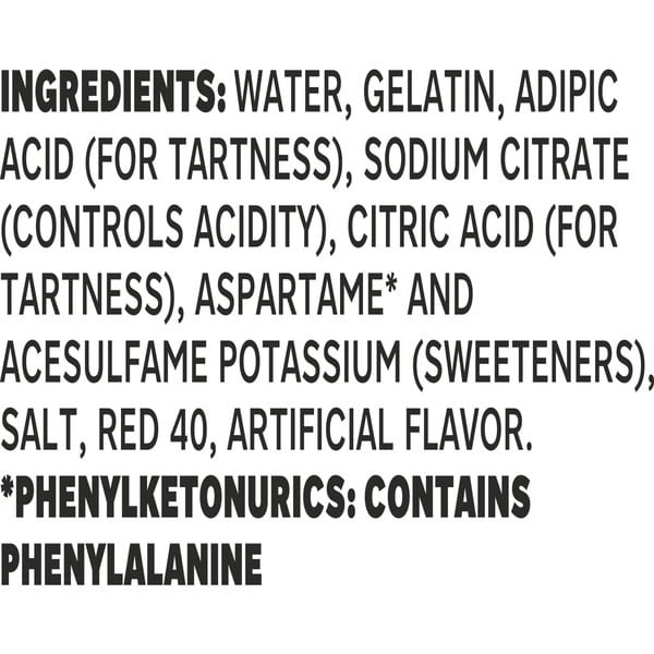 Water, Gelatin, Adipic Acid (for Tartness), Sodium Citrate (controls Acidity), Citric Acid (for Tartness), Aspartame* And Acesulfame Potassium (sweeteners), Salt, Red 40, Artificial Flavor.