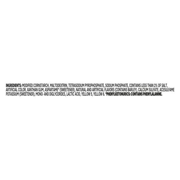 Modified Cornstarch, Maltodextrin, Tetrasodium Pyrophosphate And Disodium Phosphate (for Thickening), Contains Less Than 2% Of Natural And Artificial Flavor (contains Barley), Salt, Calcium Sulfate, Xanthan Gum, Lactic Acid, Mono- And Diglycerides (prevents Foaming), Aspartame†And Acesulfame Potassium (sweeteners), Yellow 5, Yellow 6, Artificial Color.